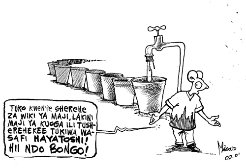Tuko kwenye sherehe za wiki ya maji, lakini maji ya kuoga ili tusherehekee tukiwa wasafi hayatoshi! hii ndio Bongo!  = We are commemorating ‘The water for all week’  but we shall celebrate feeling filthy because there is no enough water around ! That is how things are in Bongoland.